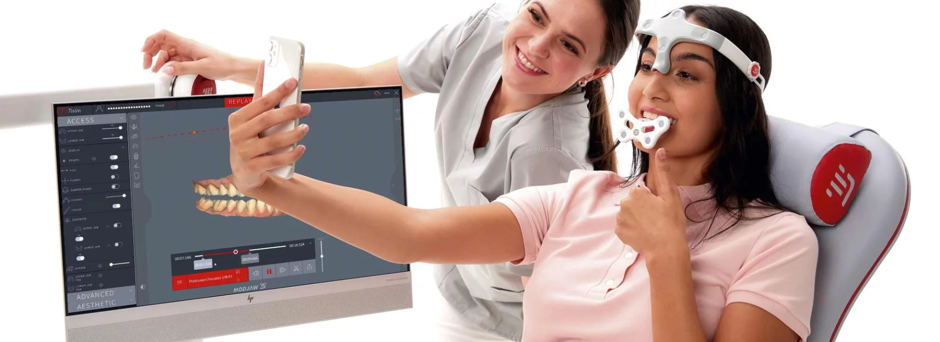 By pioneering JAW Morphodynamics™ data, MODJAW®️ offers a comprehensive platform that integrates dynamics within morphological data, marking a significant evolution in digital dentistry. This high-tech, all-in-one medical device combines an HD medical camera, touch screen PC panel, and movement trackers, offering a smooth and precise patient experience.